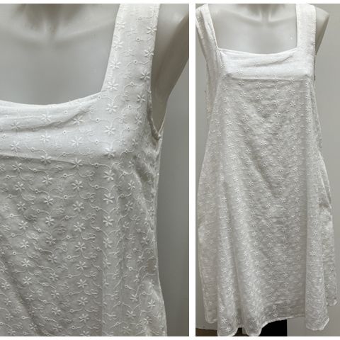 Crafted from a luxurious linen-cotton blend and intricate white anglaise fabric, this dress is fully lined to the hem for a premium feel.
