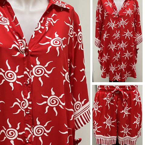 This bold and striking print, featuring a border on shorts and sleeve, adds a touch of bohemian flair to your summer style.
